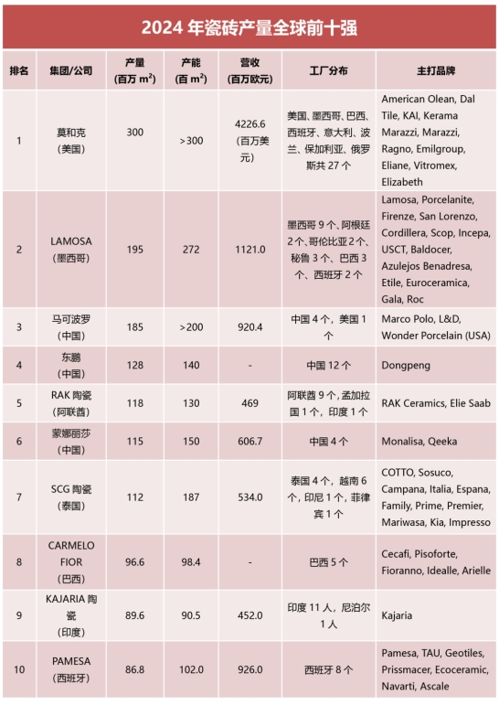 • 全球瓷磚產量10強陶企!馬可波羅、東鵬、蒙娜